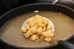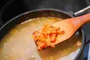 2. Если решили варить суп с сухой фасолью, то замочите её на ночь в воде с добавлением соды. На следующий день добавить её в бульон и варить до готовности, и после этого добавить картофель. Если варите суп с консервированной фасолью, то сначала почисти и нарезать картофель кубиками, положить его в бульон и варить 5 минут на среднем огне после закипания. После добавить консервированную фасоль.