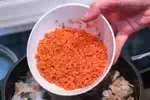 2. Красную чечевицу промыть и пересыпать в бульон. Варить на слабом огне до готовности чечевицы.
