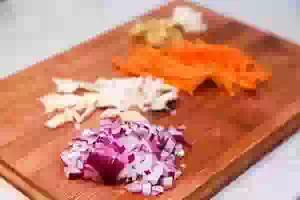 3. Лук и чеснок мелко порубить. Морковь и имбирь очистить и порезать тонкой соломкой.