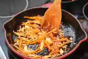 4. Разогреть растительное масло. Пассеровать в масле лук, чеснок и имбирь. Когда лук станет прозрачным, добавить морковь. Готовить все вместе, часто помешивая, 1-2 минуты. Когда чечевица будет готова, переложить пассировку в суп. Довести суп до кипения, уменьшить огонь и проварить пару минут. Снять с плиты и разлить утиный суп по тарелкам.