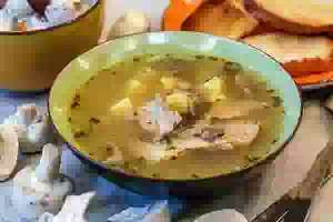 3. Пока варится бульон подготовить овощи и грибы. Очищенный картофель порезать небольшими кубиками. Лук мелко порубить. Морковь натереть на крупной терке или мелко порезать.