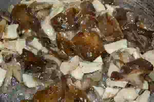 2. Подготовить заранее грибы. Когда мясо в сковороде подрумянится, добавить грибы. Перемешать грибы с курицей и жарить 5-7 минут.