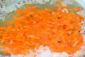 5. Натереть на крупной терке морковь и плавленый сыр. Добавить с суп морковь.