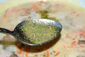 7. За пару минут до готовности супа с пшеном всыпать в кипящий суп сухой укроп и положить лавровые листики.