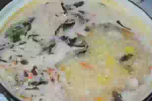 8. Дать пшенному супу с курицей и грибами закипеть и снять с плиты. Из кастрюли выловит лавровый лист и выбросить.