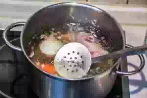 1. Потрошеных перепелов сполоснуть под холодной водой. Положить в кастрюлю, залить холодной водой и поставить на плиту. Сначала выставить максимальный огонь, и как только вода начнет закипать, уменьшить до минимально и продолжать варить, снимая шумовкой пену. Когда пена перестанет образовываться, добавить в бульон очищенную морковь и луковицу, посолить и поперчить по вкусу. Продолжить варить на слабом огне под крышкой примерно 1 час. Из готового бульона выбросить вареную морковь и лук.