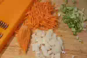 2. Пока варится бульон из перепелов, подготовить овощи. Морковь очистить, порезать соломкой (или натереть на крупной терке). Лук мелко нарезать. Стебли сельдерея очистить овощечисткой, если на имеются грубые волокна, а затем порезать маленькими кубиками. Примерно так же нарезать очищенный картофель.