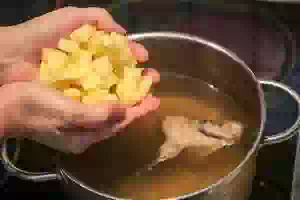 3. В кипящий бульон засыпать сначала картофель. Проварить около 5 минут на небольшом огне после повторного закипания.