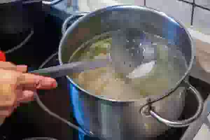 5. Тонкой струйкой, помешивая суп, влить в кастрюлю сырое яйцо.