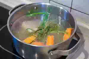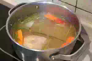 1. Сварить куриный бульон. Мясо на кости промыть, положить в кастрюлю с холодной водой. Как только вода начнет закипать, уменьшить нагрев до минимального и продолжать варить бульон, снимая пену шумовкой. Когда пена перестанет образовываться, посолить по вкусу, положить горошины перца, луковицу, морковь, стебли укропа. Продолжать варить бульон на слабом огне не менее 1 часа.