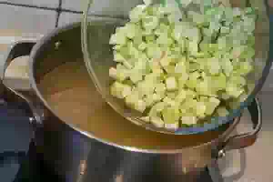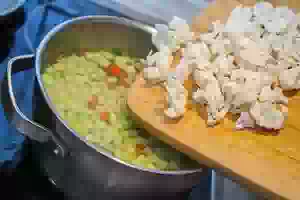 3. Пока варится бульон, подготовить овощи. Молодой тонкошкурый кабачок и цветную капусту вымыть под проточной холодной водой. Кабачки нарезать маленькими кубиками, цветную капусту разобрать на мелкие соцветия. В готовый куриный бульон положить кабачки. Как только суп повторно закипит, уменьшить нагрев и варить примерно 10 минут.