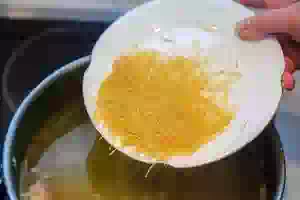 5. и засыпать вермишель. Положить мелко нарезанную свежую зелень и продолжать варить примерно 8 минут.