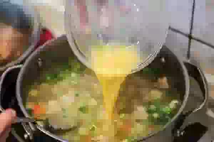7. Тонкой струйкой, помешивая суп, влить в кастрюлю сырое яйцо. Дать супу закипеть и снять кастрюлю с плиты. Яйцо успеет свариться, превратится в кудрявые хлопья. Готово! Кудрявый куриный суп с вермишелью, сырым яйцо, цветной капустой и кабачками можно разливать по тарелкам и подавать на стол.