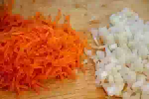 2. Пока тесто на расстойке, почистить лук и морковь. Лук мелко порубить, морковь натереть на крупной терке.