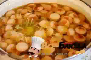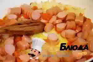 3. Добавляем порезанные кружочками сосиски. Обжариваем.