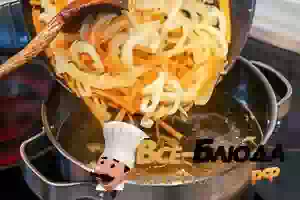 3. В сковороду налить 1 ст.л. растительного масла, прогреть и добавить имбирь с чесноком. Помешивая, подержать пряности в масле, чтобы ароматизировать масло, и как только лук и чеснок начнут менять цвет, выбросить их из сковороды. В сковороду добавить поочередно лук, морковь, перец. Овощи хорошо перемешать и дать им немного обжариться, чтоб только слегка поменяли цвет.