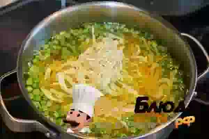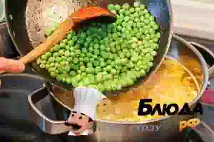 5. Затем добавить в суп замороженный зеленый горошек. Прибавить огонь и как только суп закипит, опять снизить нагрев. Варить 5 минут.
