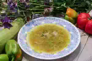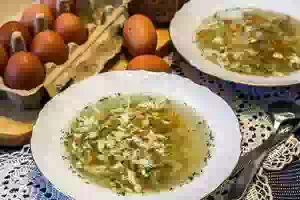 Кудрявый куриный суп с вермишелью, овощами и сырым яйцом