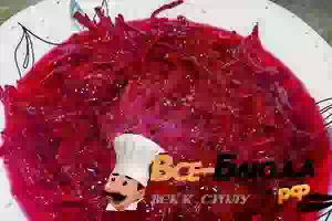 1. Прежде всего, надо вскипятить воду. Свёклу почистить, натереть на крупной тёрке. Залить её кипятком, добавив 1 ч.л. сахара и 1 ч.л. уксуса, и оставить мариноваться.