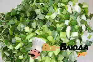 1. Сначала нужно приготовить для окрошки заправку из майонеза и желтков. Для этого очистить вареные яйца, вынуть 2-3 желтка, сложить их в миску, добавить майонез и растереть. Вымыть зеленый лук, стряхнуть влагу, удалить при необходимости корешки и мелко изрубить ножом. Высыпать в кастрюлю.