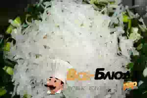 2. Вымыть дайкон, можно нарезать на мелкий кубик, но окрошка будет вкуснее, если дайкон натереть его на крупной терке. Сделать это можно прямо в кастрюлю, где уже лежит лук.