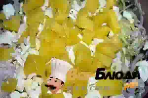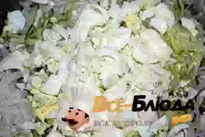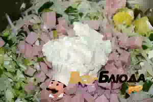 4. Изрубить ножом оставшиеся белки и целые яйца. Добавить в кастрюлю к остальным продуктам.