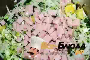 6. Колбасу нарезать кубиками и добавить в кастрюлю с овощами и яйцами.