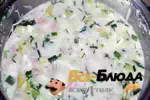 8. Перемешать все ингредиенты. Залить окрошку березовым соком. Его нужно налить до желаемой густоты блюда холодного супа.