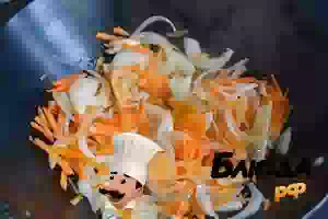 1. Кабачковый суп готовить лучше в казане, но можно и в воке. Вок разогревается с маслом и в него поэтапно, по мере нарезки (или натирания) опускается морковка (натертая) с луком (порезанным).