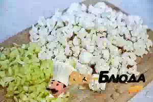 1. Цветную капусту разобрать на маленькие соцветия. Сладкий перец порезать соломкой. Стебли сельдерея очистить овощечисткой от толстых грубых волокон и порезать мелкими кубиками. Очищенную морковь порубить примерно такими же кубиками, как и сельдерей. Сочный спелый помидор порезать дольками. Все овощи сложить в миску, посолить, перемешать и полить маслом.
