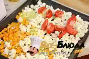 2. Подготовленные овощи переложить на противень и поставить в прогретую до 180С духовку. Запекать до тех пор, пока все овощи, кроме цветной капусты, не станут мягкими. Цветная капуста должна оставаться чуть хрустящей.
