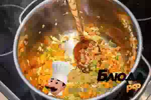 4. В кастрюле для варки супа разогреть немного растительного масла, добавить овощи (кроме горошка) и пассировать, помешивая, до мягкости.