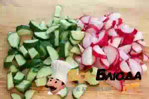 2. Цветную капусту, разобранную на соцветия, опустить в кипящую подсоленную воду и проварить 5-7 минут. Капуста должна быть слегка недоваренной и похрустывать. Переложить отваренную цветную капусту в холодную воду, остудить и отправить на дуршлаг. В салатнике смешать цветную капусту и тертые вареные яйца. Туда же отправить нарезанный кубиками вареный картофель, огурцы и редис.