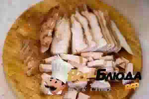 3. Остывшую запеченную грудку порезать мелкими кубиками и положить к остальным продуктам. Туда же отправить рубленую зелень. Все посолить, поперчить и перемешать.