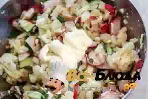 4. Положить сметану (йогурт или майонез). Перемешать.