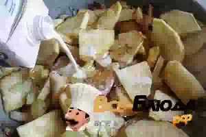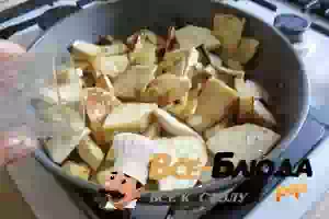 1. Все корень сельдерея очищаю, обмываю и нарезаю для обжарки не крупными кусочками. Сначала на сковороду с растительным маслом отправляю ломтики сельдерея и готовлю, помешивая, до мягкости.