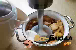 4. После закипания снимаю кастрюлю с сельдереем с огня и взбиваю ее погружным блендером, подливая по мере надобности кипяток из чайника. Приправляю специями по вкусу.