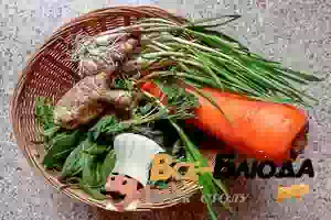 3. Прикорневую белую часть и зеленые перья чеснока вместе с остальной зеленью мелко порубить. Морковь почистить и натереть на терке. Очищенную земляную грушу нарезать крупными кубиками. Копченое мясо порезать мелкими кубиками.