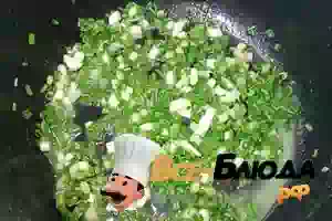 1. Первым делом включаем мультиварку и ставим ее в режим «Подогрев». Через 2 минуты на дно чаши кладем сливочное масло, чтобы оно растопилось. Измельчаем зеленый лук и бросаем в мультиварку. Переключаем режим «Подогрев» на режим «Жарка» и пассеруем лук 3-4 минуты, при этом постоянно его помешиваем, чтобы не подгорал.