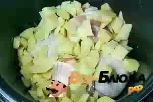 4. К обжаренному зеленому луку в чашу мультиварки сначала кладем промытую гречку, затем куриные бедра и нарезанный картофель.