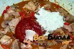 6. Следующим этапом - муку и томатную пасту. Интенсивно перемешать, поварить всё пару минут.
