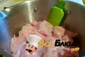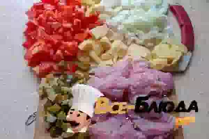 1. Подготовить продукты. Филе индейки порезать небольшими кусочками примерно 2х2 см. Лук очистить и мелко порубить. Картофель, помидоры, сладкий перец и соленые огурцы порезать небольшими кубиками.