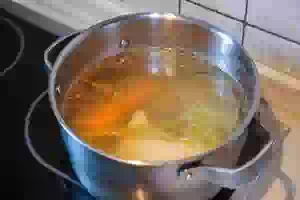 5. Добавить в кастрюлю с бульоном сначала картофель. Как только суп начнет закипать, положить в суп тертый кабачок. Размешать, пусть варится на слабом огне примерно 7 минут.