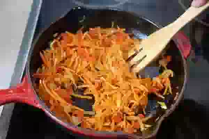 4. Приготовить овощную пассеровку. В сковороде разогреть растительное масло. Добавить лук, морковь и сладкий перец. Пассеровать, помешивая лопаткой, до мягкости овощей.