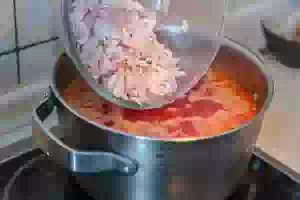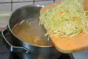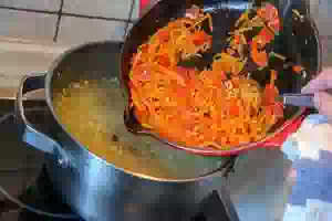 7. Через 5 минут можно отправлять в кастрюлю овощную пассеровку. Перемешать, попробовать бульон, и если надо, добавить еще соль.