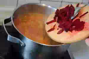 8. Последней из овощей положить в кастрюлю свекольную ботву и свеклу. Для баланса вкуса добавить немного сахара и влить ложку уксуса, чтобы сохранился цвет и появилась легкая кислинка. Варить на слабом огне примерно 5-7 минут. Свекла в супе должна оставаться слегка хрустящей.
