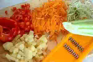2. Пока варится бульон, подготовить овощи. Картофель очистить, нарезать маленькими кубиками. Примерно также нарезать сладкий перец. Молодой кабачок и морковь натереть на крупной терке или на терке для корейской моркови. Репчатый лук мелко порубить.