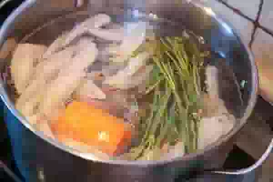1. Сварить куриный бульон. Для этого мясо на кости (у меня были куриные крылья) сложить в кастрюлю, залить холодной водой и поставить кастрюлю на средний огонь. Как только вода начнет закипать, уменьшить нагрев до минимального и продолжать варить бульон, снимая пену шумовкой.