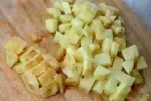 3. Пока варится бульон, подготовить овощи. Картофель очистить (молодой картофель можно хорошо промыть и потереть щеткой, но не чистить) и на резать кубиками.