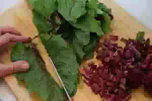 5. У молодой свеклы отрезать ботву, хорошо её промыть. Молодые свеколки вымыть, очистить от кожицы, срезая ее как можно тоньше. Нарезать соломкой свеклу. Листья ботвы сначала разрезать вдоль пополам, а затем произвольно нарезать, но не очень крупно.